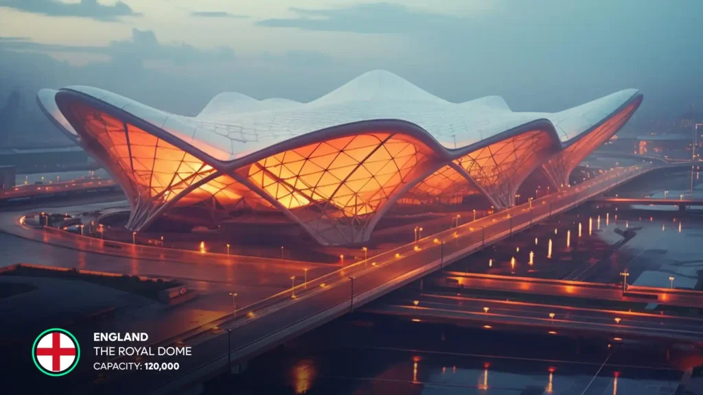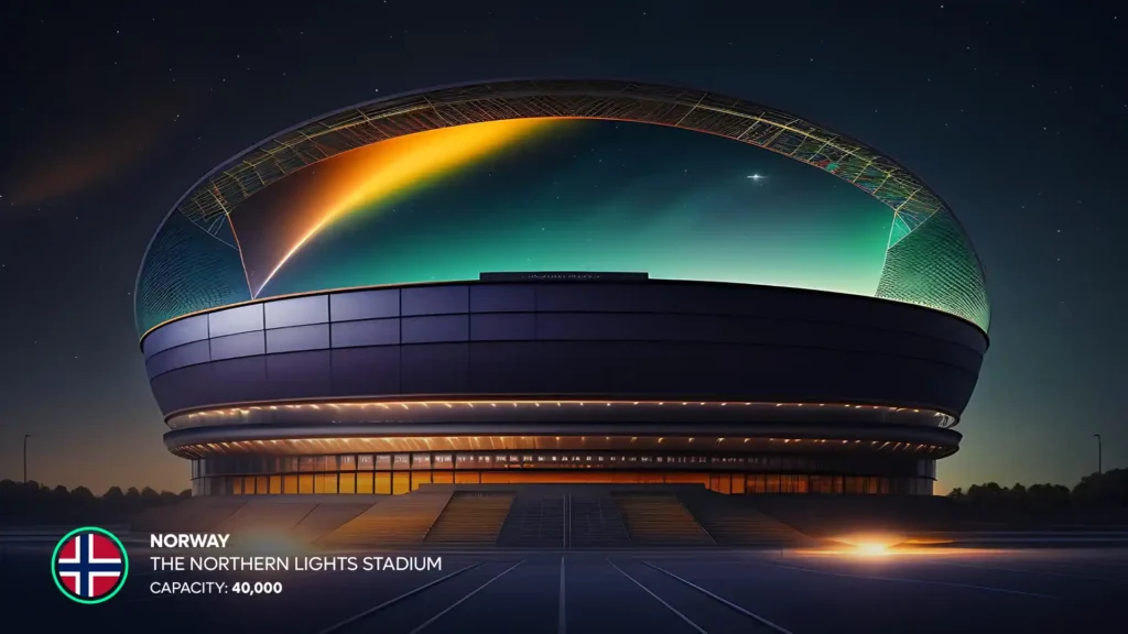 A stunning glass-domed stadium set within the Arctic Circle, where a transparent roof lets fans witness the mesmerizing aurora borealis while the match unfolds below. Fully enclosed and climate-controlled, it would offer a comfortable experience despite Norway’s extreme cold.