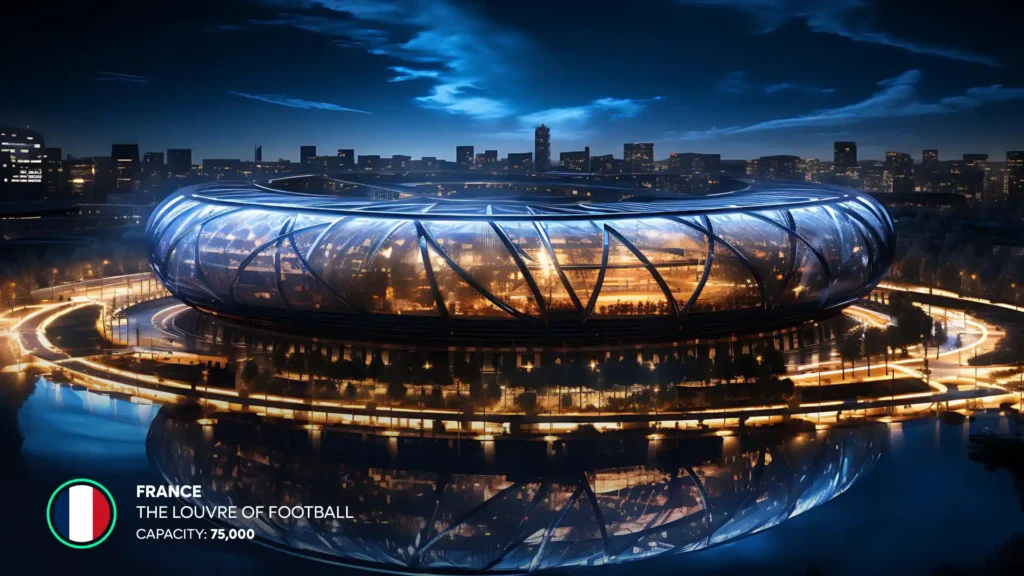 A glass-covered architectural masterpiece blending art and sport. The roof would resemble the Louvre Pyramid, and the interior would feature golden lighting inspired by the Eiffel Tower at night.