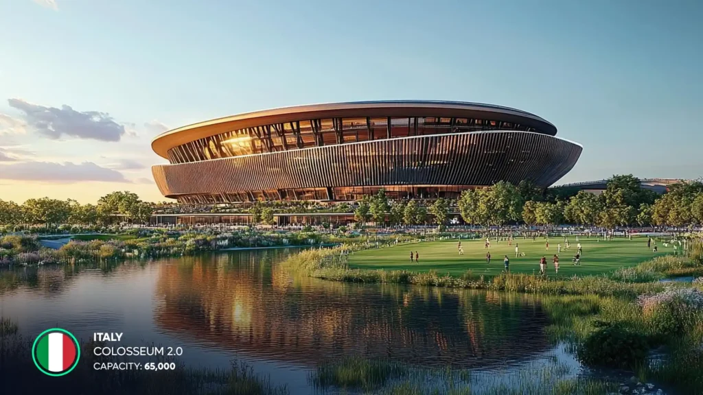 Built on ancient Roman principles, but with retractable arches and marble-inspired materials. The structure would combine history with ultra-modern tech — where gladiators once fought, now football heroes play.