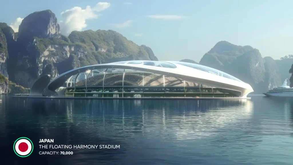 A futuristic stadium floating on water — an innovative solution for Tokyo, where land is scarce and extremely expensive. The design envisions a lightweight, transparent membrane roof supported by a flexible structure engineered to withstand seismic vibrations, perfectly blending technology, resilience, and creativity.