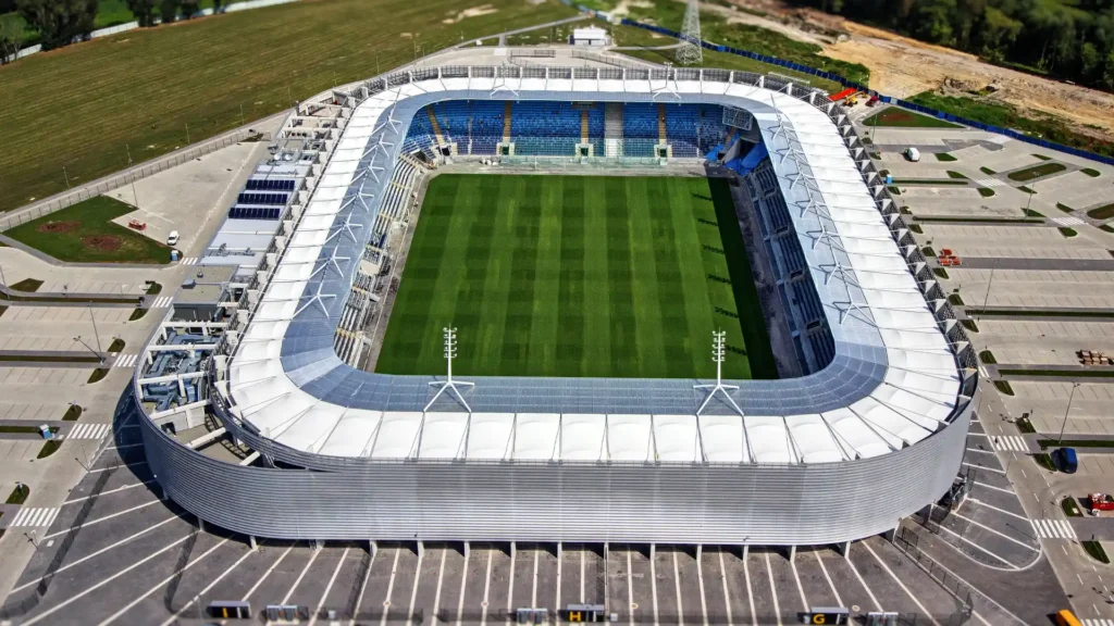 Bright yellow seats and a balanced structure make this stadium instantly recognizable among Polish fans.